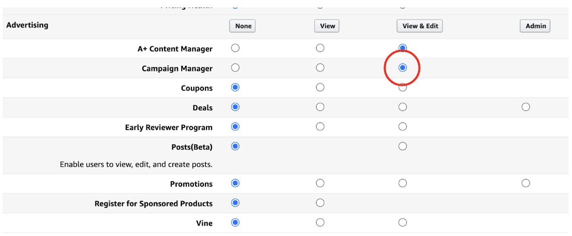 Sometimes, permissions do not sync ****between Amazon Ads and Seller Central. Often, it’s because someone accidentally removes this permission. Check Seller Central permissions to make sure the Campaign Manager permissions are set as you see here: