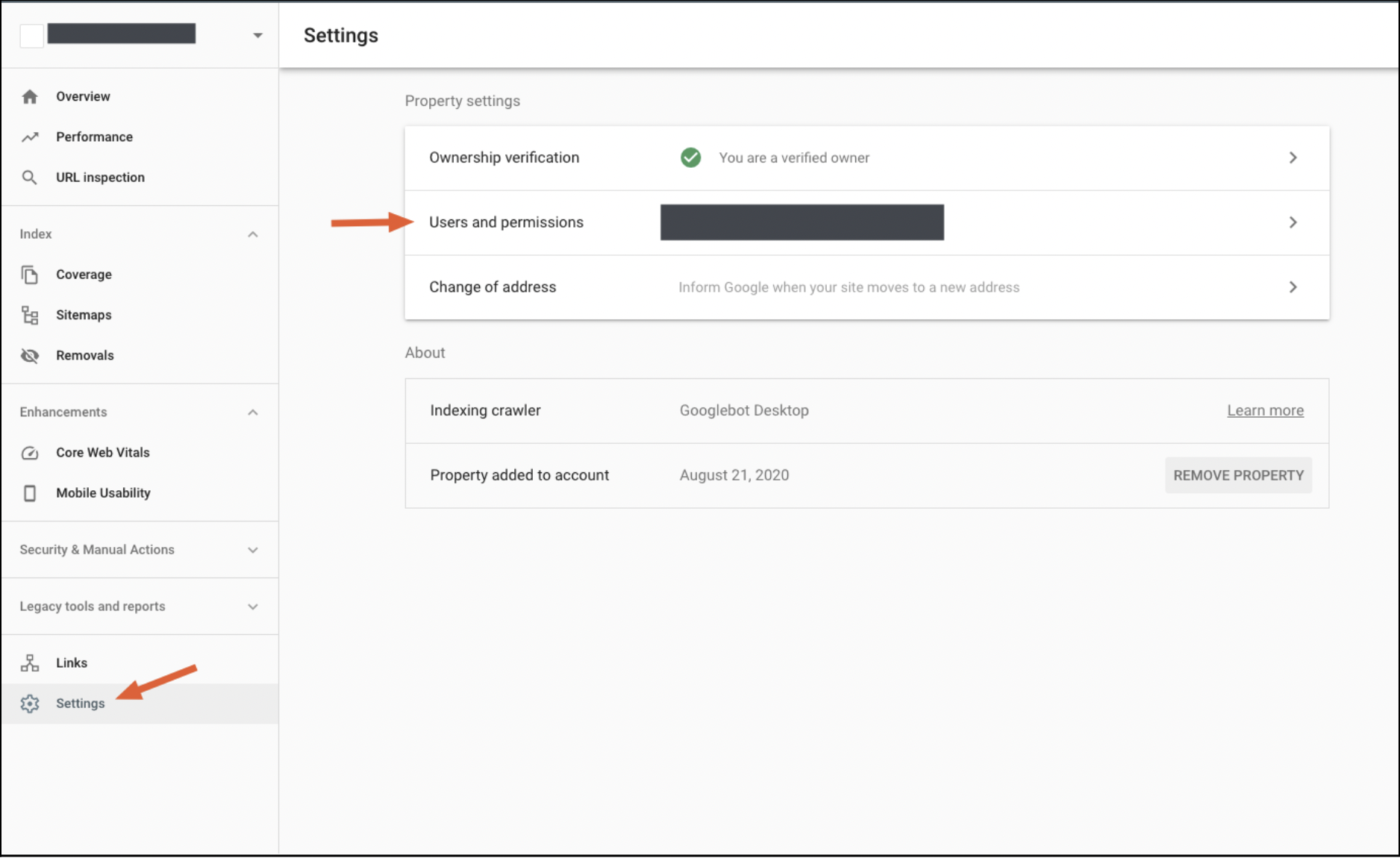 Navigate to Google Search Console Settings & Click on Users and permissions