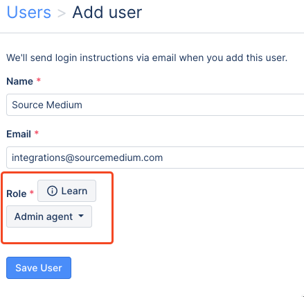 - Fill in the Name as SourceMedium, Email as integrations@sourcemedium.com, and make sure to select the Role as Admin Agent