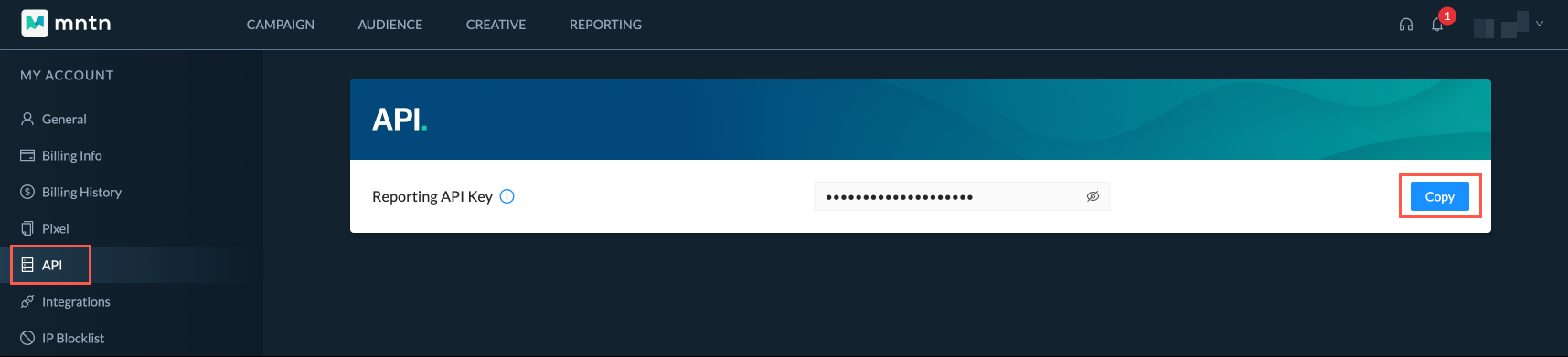 - Send an email to SourceMedium at integrations@sourcemedium.com containing your store’s name, the platform we are connecting with (in this case MNTN) and your MNTN API Key