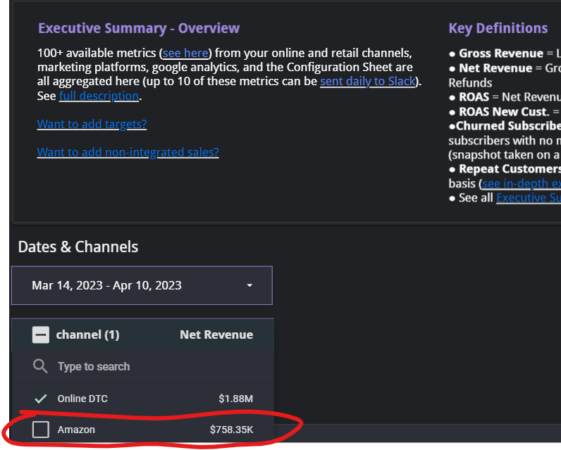Once SourceMedium and Amazon are fully connected, you’ll see Amazon as an option in the “Channel” dropdown at the top of the pages in your dashboard.