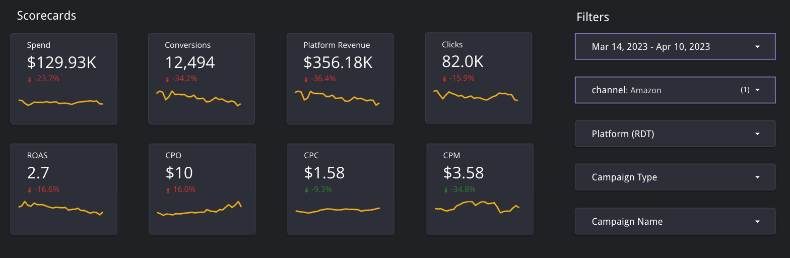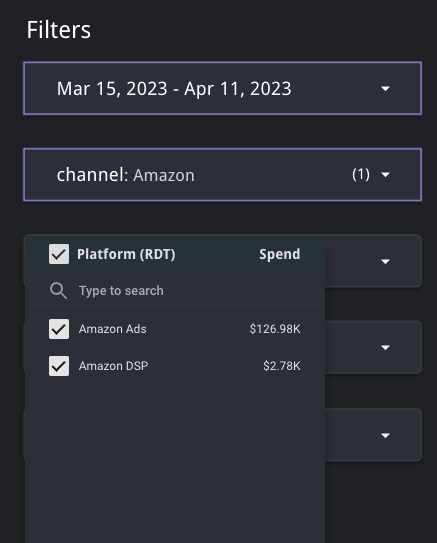 Platform (RTD) filter allows you to select between Amazon Ads and Amazon DSP.All platforms for a given channel are selected by default.