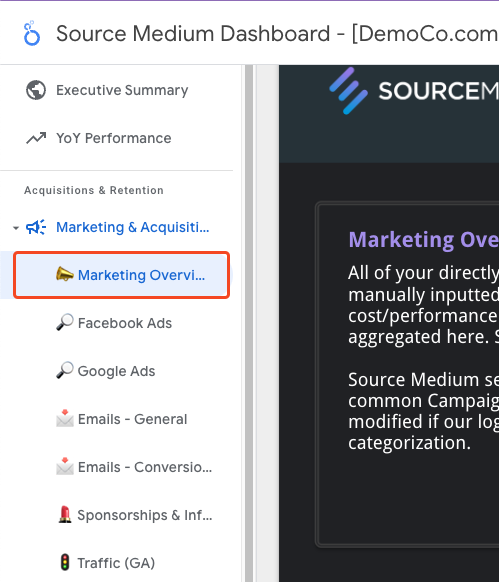 After your marketing data has been ingested and integrated into our data model, you can find it on our Marketing Overview page. This can be found inAcquisitions & Retention section of the side bar, under the Marketing & Acquisition drop-down.