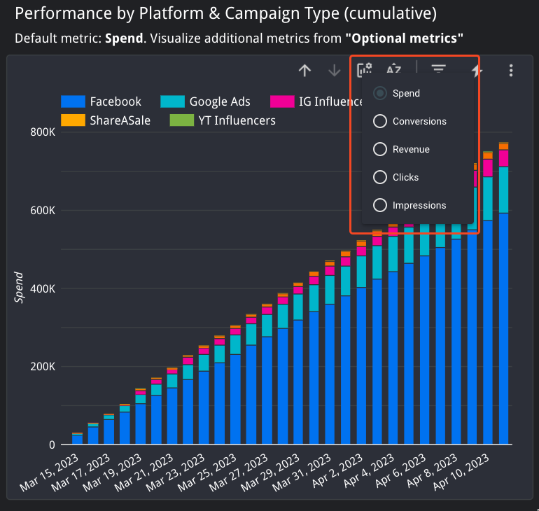 The cumulative and non-cumulative Performance by Platform & Campaign Type graphs show performance by platform on the left and by campaign type on the right.These performance graphs also allow you to change the performance metric shown. Click Optional Metrics button to select your desired performance metricThe bar graphs default to Spend and the time-series line graphs default to ROAS.