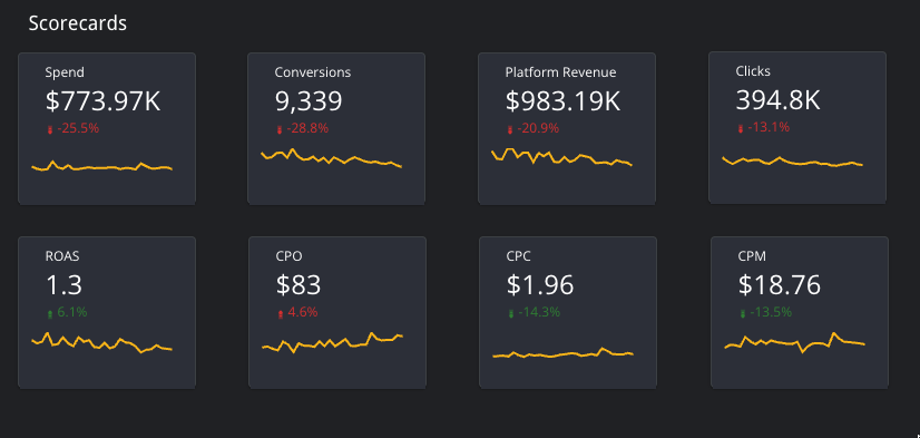 The Scorecards section at the top of the page give you a quick overview of the filtered marketing data for your selected date range.The small percentage and arrow indicate the percent change of each metric when compared to the previous period same length, as defined by the Date Range Selector.