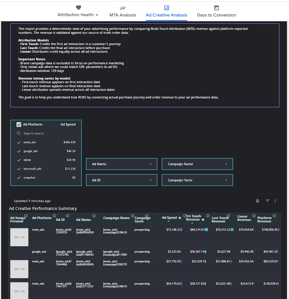SourceMedium MTA data architecture and modeling powers a robust suite of detailed reports to help you analyze and optimize your marketing efforts. If desired, you can customize these MTA reports for your use case—and you can even build custom BI solutions or train machine learning models directly on top of the Unified Purchase Journey MTA data from your managed data warehouse.