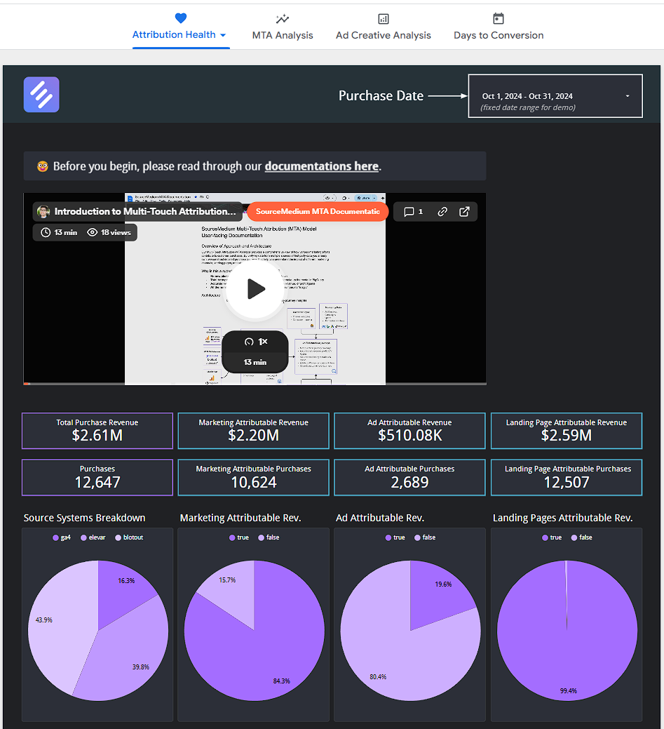 SourceMedium MTA built-in reports are part of a standalone dashboard separate from your main SourceMedium dash. After MTA is enabled for your account, the dashboard link will be pinned to your shared Slack channel or sent via email/gchat if you do not use Slack. The sections below describe each of the default modules and their functionality.