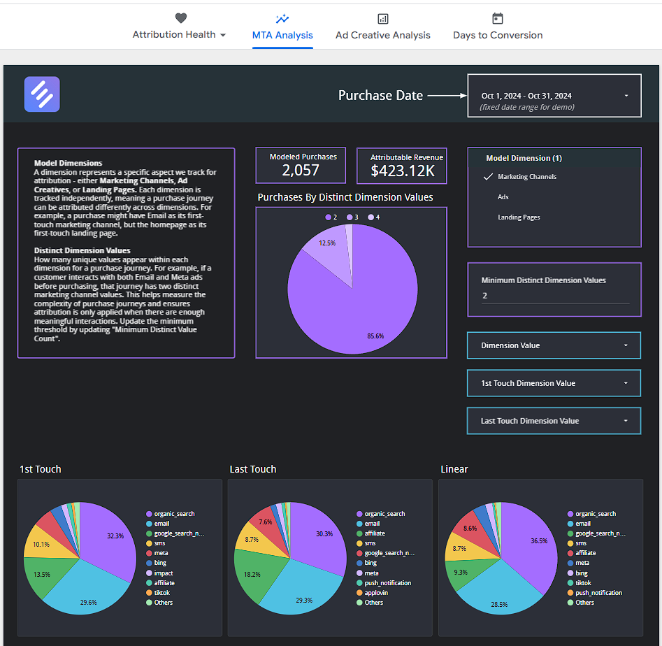 Our model provides a comprehensive view of how various marketing efforts contribute to customer purchases. By unifying data from multiple sources of first party data you already own, we construct detailed purchase journeys that help you understand the impact of different marketing channels, landing pages, and ad creatives. In the sections below, this document will provide everything you need to know to get started with SourceMedium MTA.If you have a specific question and you’d like to skip the overview guide, check out our MTA FAQs or use the AI-enabled search bar above to