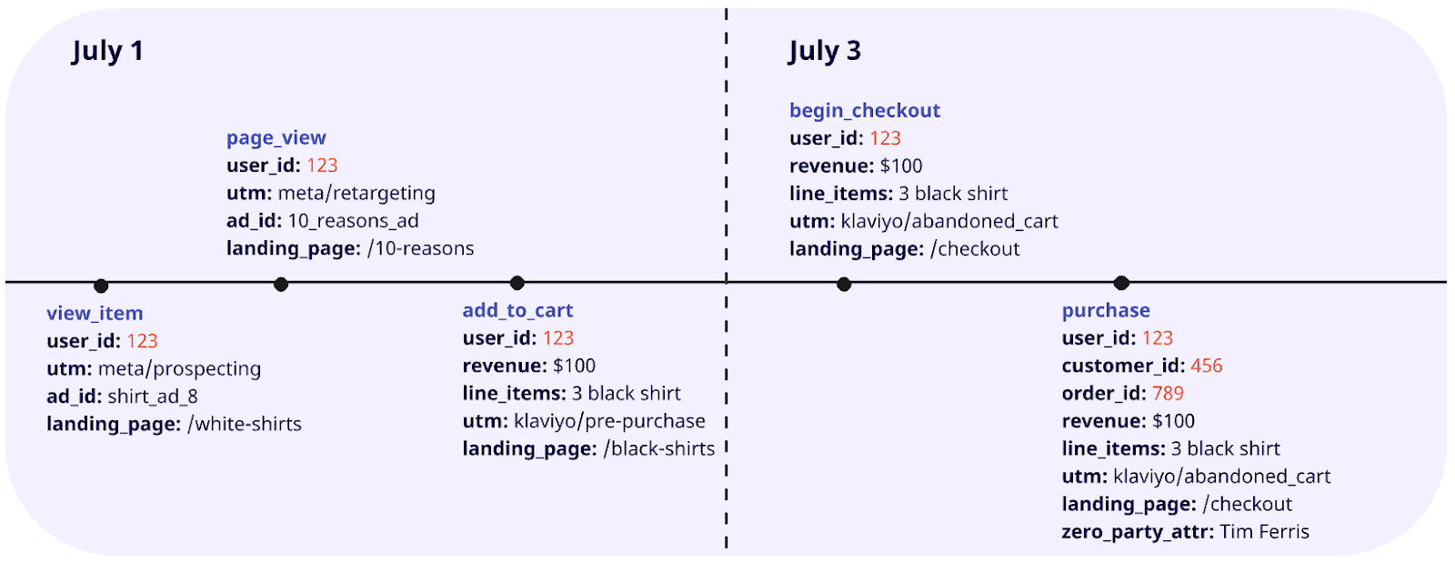 - The Unified event Schema is combined with Marketing Data, Orders Data, Customer Data, and User Inputs using the appropriate identifier matching for each to create a set of Unified Purchase Journeys which you’ll see on the right-hand side of the chart