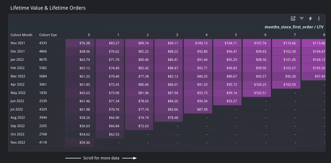 🧊 Will help uncover deep insights on your business Our dashboards are flexible, and like an iceberg will uncover more of our deep data layer as new use cases emerge. We intelligently aggregate multiple first-party data sources to analyze customers, orders, and products at a more granular level so you can run meaningful analysis vs. just high level reporting.